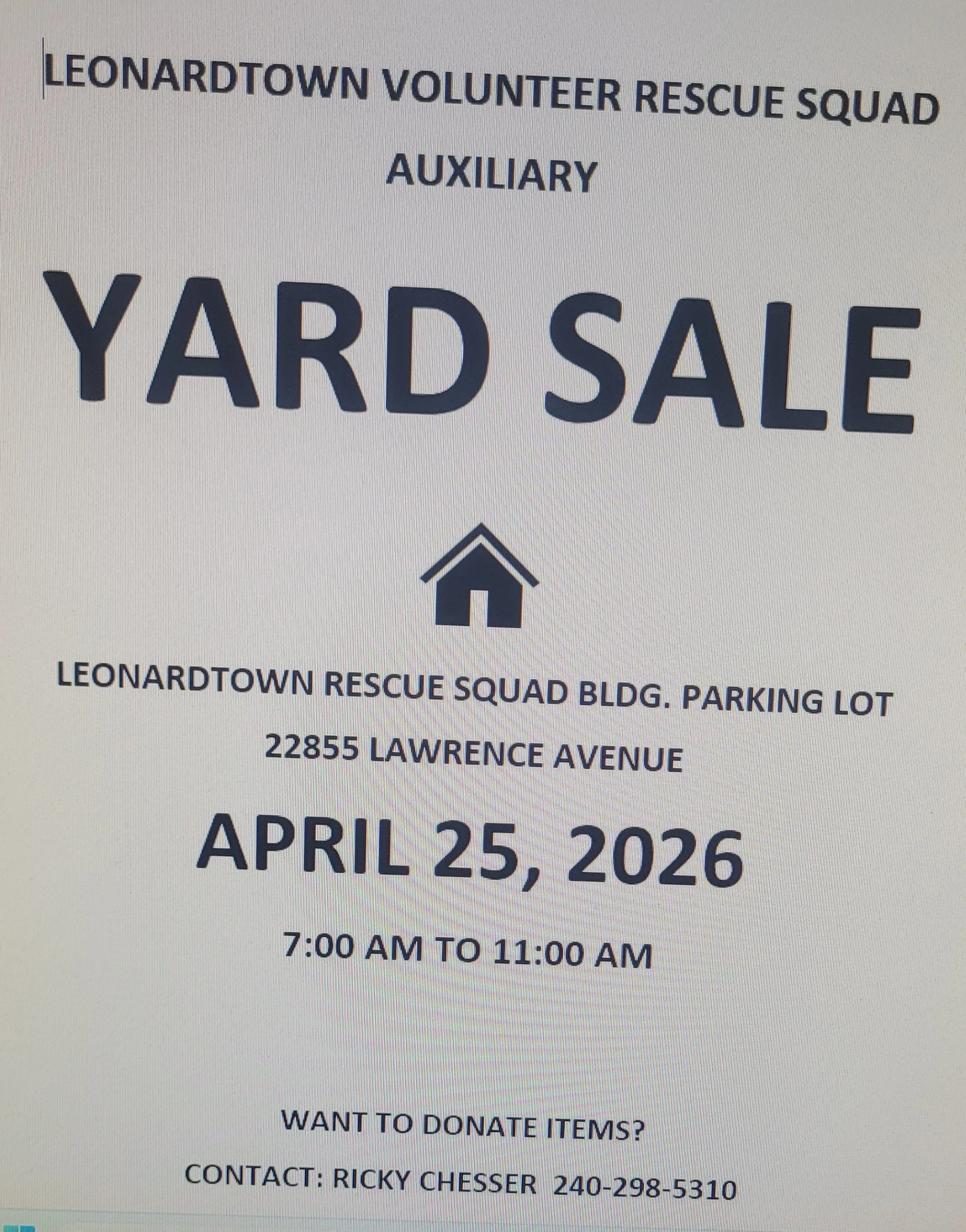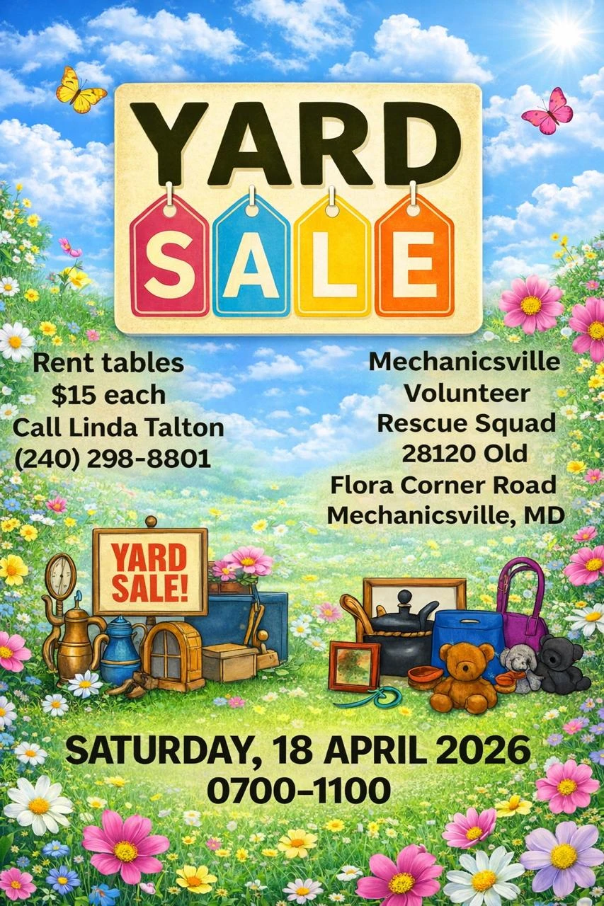Don't miss the Spring Yard Sale sponsored by the Ladies Auxiliary of the Hollywood Volunteer Fire Department on Saturday April 25th from 7 am to 11 am. The Sale will take place at the Fire Department. Price per space $20. Cash or Check. RAIN OR SHINE. Bring your own table or tarp. Payment Will be collected the day of the Yard Sale. To Reserve your Space please contact: Amy Hall: 301-904-7239. To Benefit the Ladies Auxiliary of the HVFD Sunshine Fund